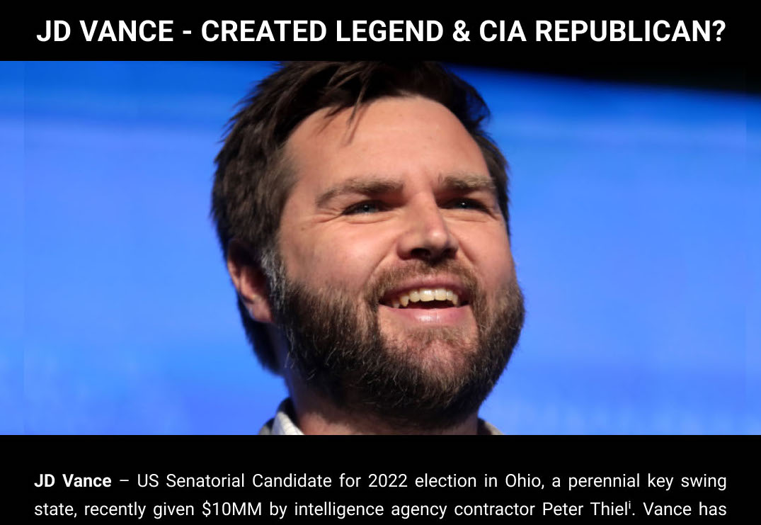 JD Vance – US Senatorial Candidate for 2022 election in Ohio, a perennial key swing state, recently given $10MM by intelligence agency contractor Peter Thiel ((https://www.forbes.com/sites/zacheverson/2022/05/06/thiel-was-good-for-10-million-but-jd-vances-other-billionaire-backers-were-good-for-nothing/?sh=6d1372002c16)). Vance has been through
