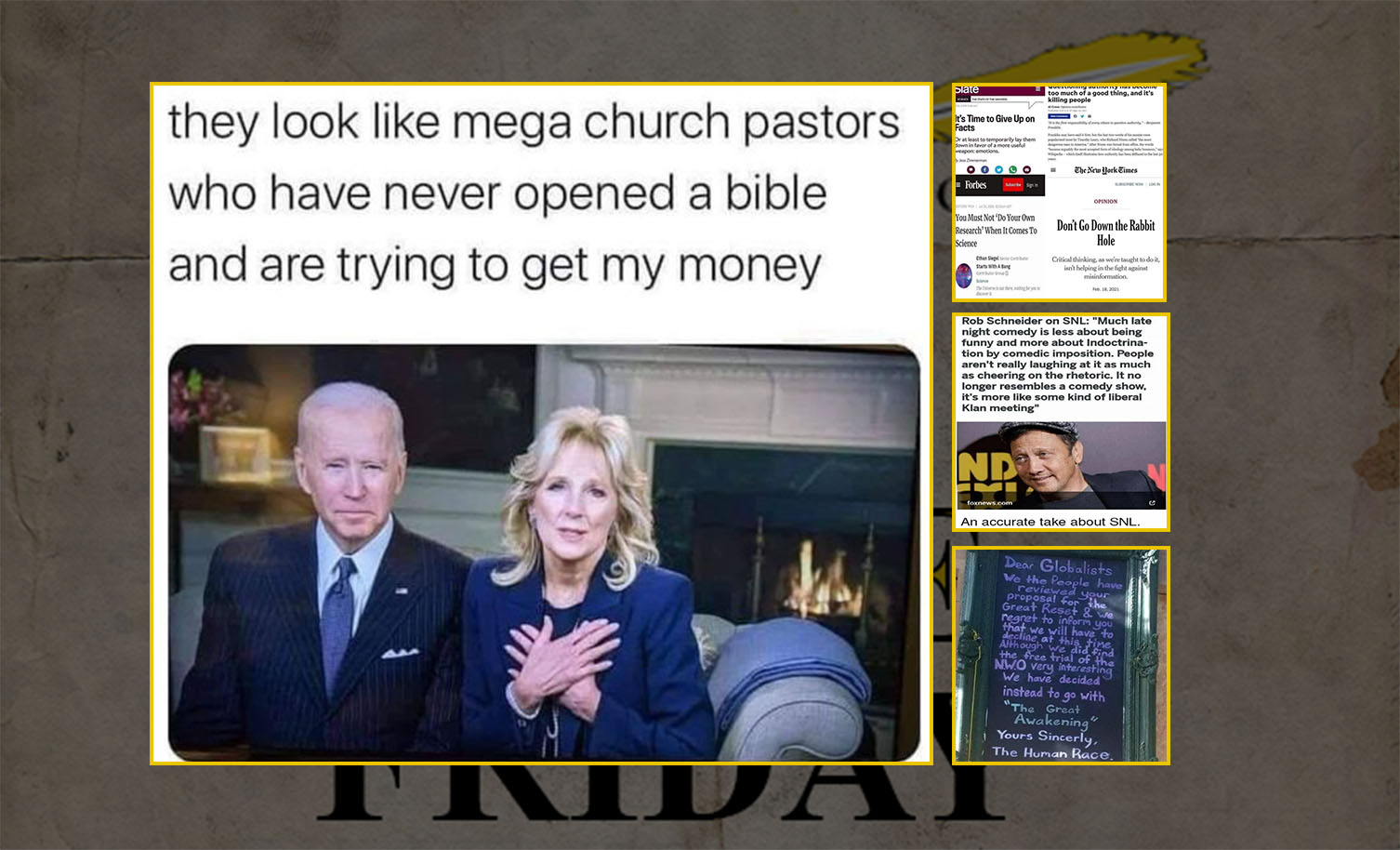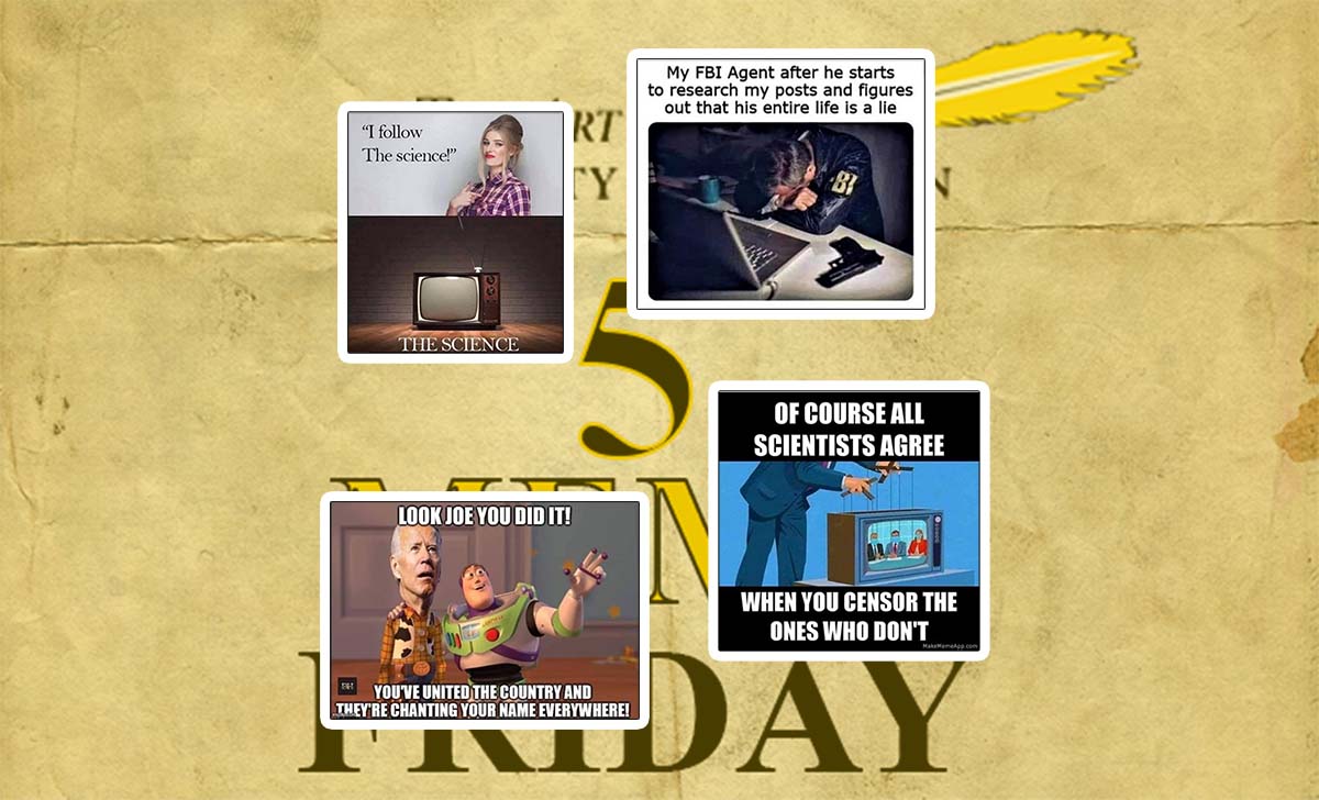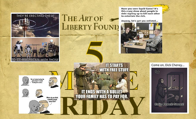 5 Meme Friday delivers 5 hard hitting memes to your inbox every Friday (occasionally a couple of days later) and the best videos and news from the alternative media. Subscribe at: https://dev3artofliberty.stepintomedia.com/five-meme-friday/ or through RSS at https://follow.it/aolf-five-meme-friday.