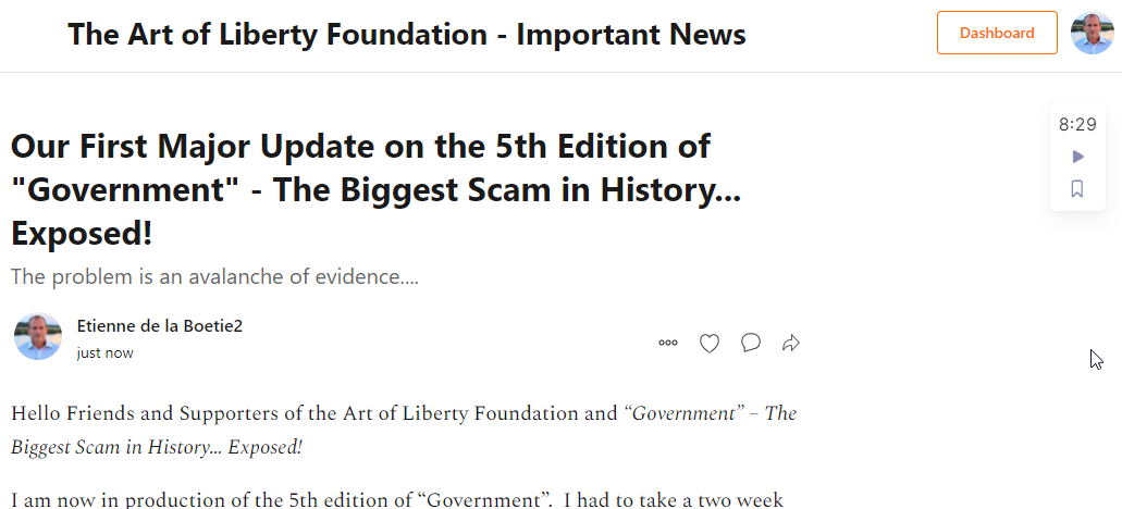 A start-up public policy organization: Voluntaryist crime fighters exposing inter-generational organized crime’s control of the “government,” media and academia. The foundation is the publisher of “Government” – The Biggest Scam in History… Exposed! , and its companion media: The Liberator– our expose of “government” illegitimacy and criminality, ArtOfLiberty.Substack.com – our original writings and research, The Daily News – a curated feed of the best of the alternative media, censored truth videos, and more on Substack and Telegram, Five Meme Friday – a lower volume weekly summary of the Daily News and at least five fresh, hot, dank liberty memes on Substack and Telegram, and “Government,” Media, and Academia Exposed! – A Telegram summary of the best mainstream and alternative news stories proving our thesis that all three are being hierarchically controlled by inter-generational organized crime interests.