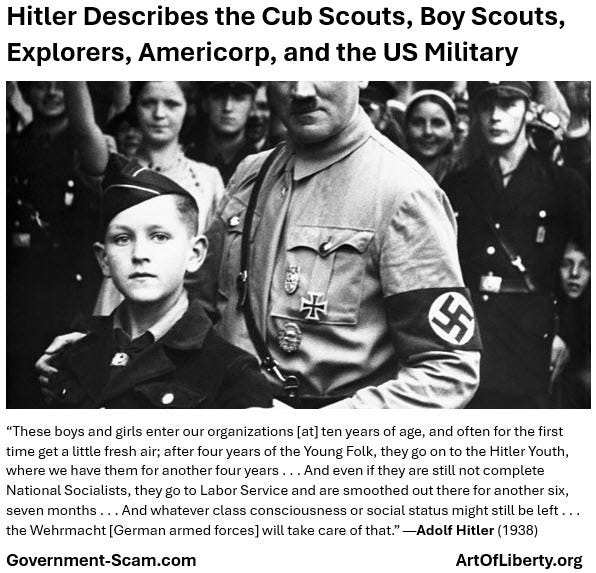 “These boys and girls enter our organization at 10 years of age. and often for the first time, they get a little fresh air. After four years of the young folk, [which is the equivalent of our Cub Scouts,] they go on to the Hitler Youth, [which is the equivalent of our Explorer programs,] where we have them for another four years. And even if they’re not complete national socialists, [statists, believers in government,] they go on to the labor service, [AmeriCorps,] where they’re smoothed out there for another six or seven months. And whatever class consciousness or social status might be left, the Wehrmacht, the German armed forces, will take care of that.”