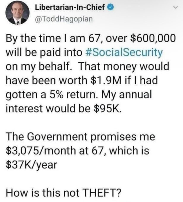 And by the way, it’s a Ponzi scheme and it’s actuarially impossible for it ever to pay out the things. And so we’ve all been hoodwinked by this organized crime system that has stolen all of our money and then blown it on weapons systems that we don’t need and ethanol subsidies and a bunch of bullshit. They’re stealing the money out the back door. and the monopoly media isn’t really telling us what’s going on. But the core of all of that is it’s impossible to have a legitimate government. I’ve been doing this for five or six years now. I have never, ever, ever had anybody disagree with that.