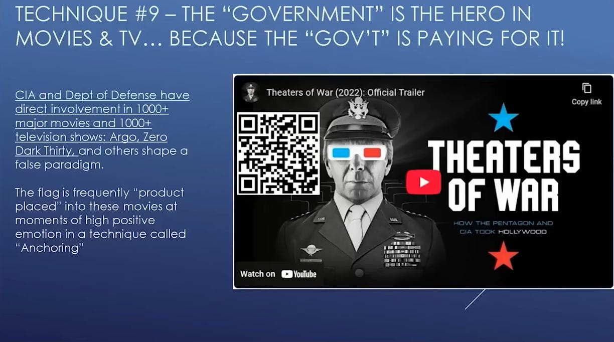 I wanna go back one to technique nine, which you mentioned earlier, where the government and the Department of Defense have direct involvement in over 1,000 major movies and 1,000 television shows that we know of. where they’re product placing the flag at moments of high positive emotion using this advertising technique called anchoring. And so they’ll build the audience up to a moment of high positive emotion. This is the trailer for a movie called Theaters of War. where they’re breaking down the scholarship behind all of these claims and how the Department of Defense has script control. And they’re actually changing history. And so, like, if you want to shoot a movie about Vietnam, you can’t have a scene about the My Lai Massacre. You can’t have a scene about a lot of the crimes that the troops committed in Vietnam, or you’re not going to get the money, or shoot on military bases, or military equipment, or anything that you want. The first part of the process is you give, the Pentagon actually has an office in Hollywood, and you have to give them your script, and then they read the whole script, and then they excise out, like, you can’t do this, you can’t do that. And then they give the script back to the director. And if the director wants the military bases or the extras or the F-18 jets, like in Top Gun Maverick, you’ve got to make the government look good.