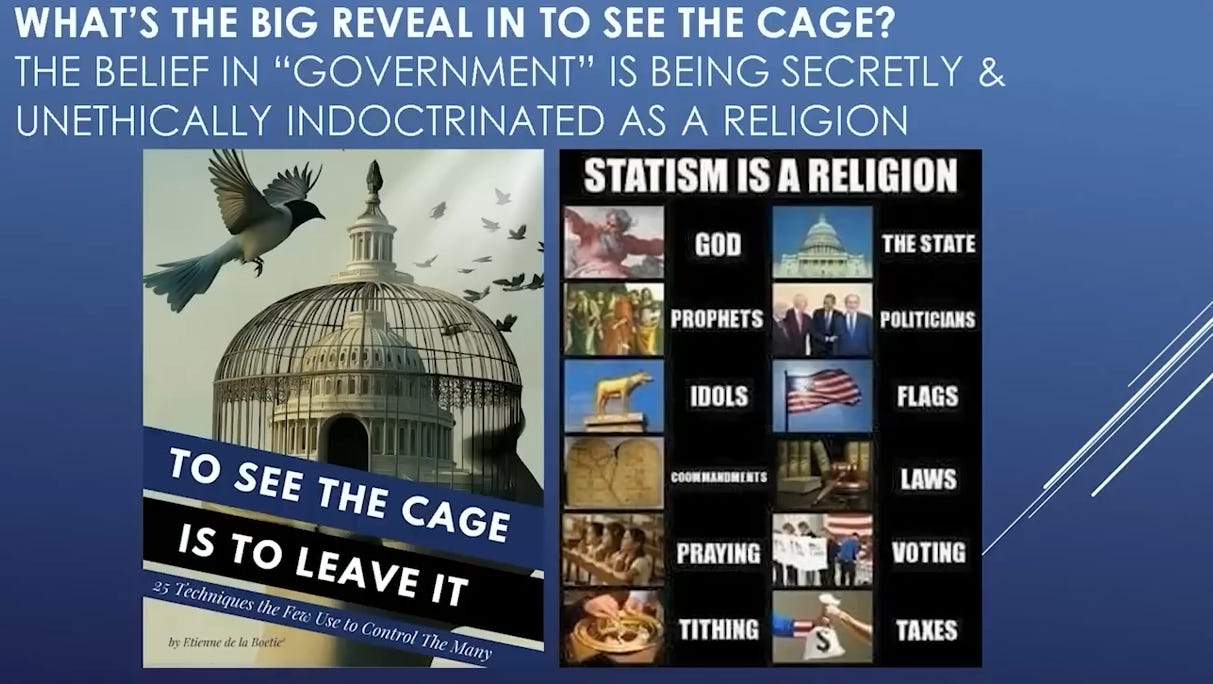 So what is the big reveal in my new book To See the Cage is to Leave It – 25 Techniques the Few Use to Control the Many? And the belief in government is being secretly and unethically indoctrinated as a religion. Now, they’re not calling it a religion, but they’re using all of the same tricks and techniques that an unethically manipulative religion or a cult would use on their followers.