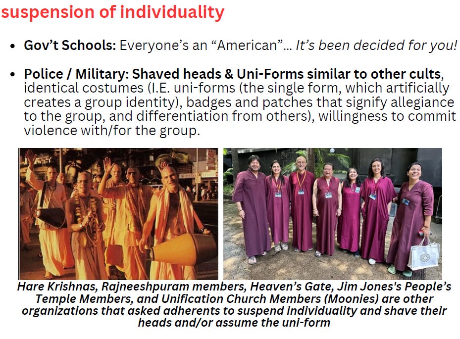 They’ve been indoctrinated that it’s legitimate, that they have rights that other people don’t, because they represent the government and they can use violence on peaceful people, even though it’s immoral, because they’ve been put through these various techniques. Now, we talked about the Cub Scouts and the Young Marines and everything like that, but really, they turn up the heat when it gets to the police and military. The police and the military, I could talk about dozens. I broke the police and the military in the book. We break down 25 techniques. But I, you know, I did one technique for the police, one technique for the military, but, but assumed under those are actually dozens and dozens of unethically manipulative techniques that are used on the police and on the military in their training to create this obedience. And these include verbal and physical abuse, excessive stress, degradation and humiliation, sleep deprivation, isolation, the artificial conformity of the uniform.