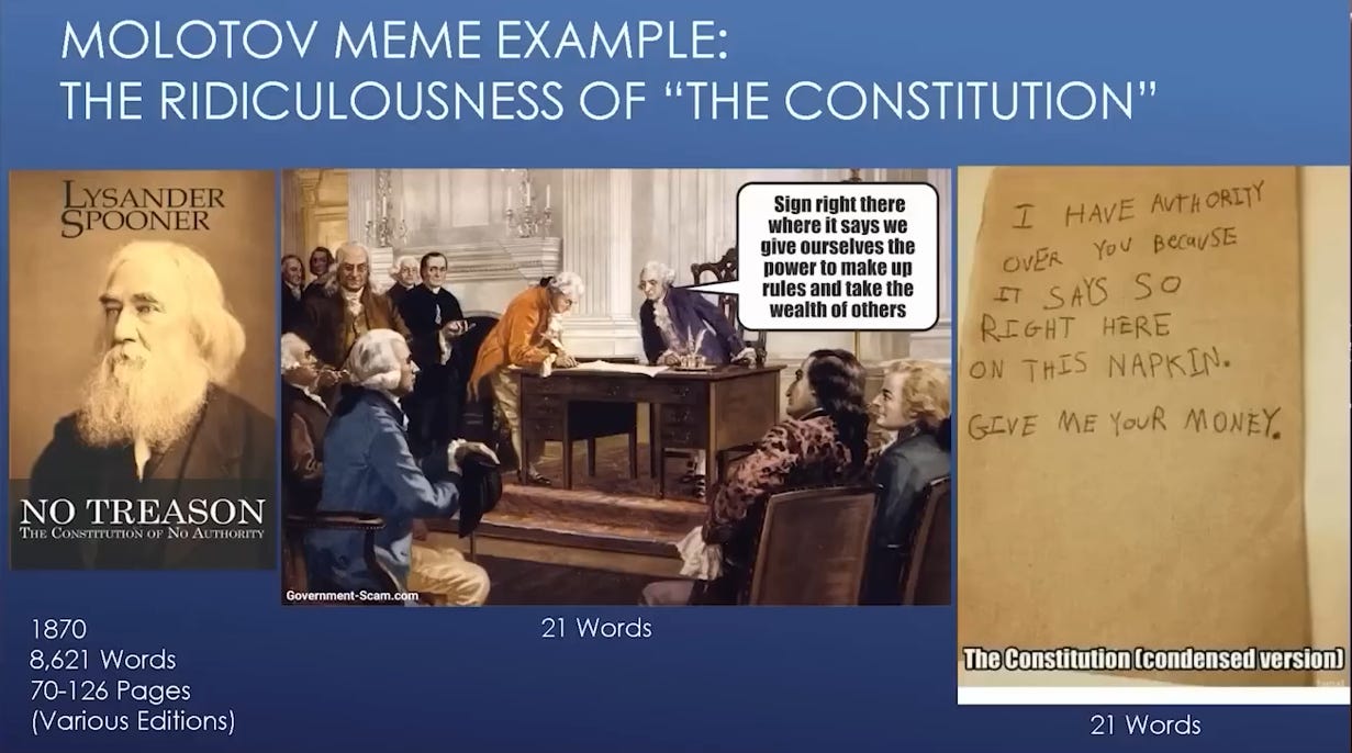 You can’t be bound by this social contract that you yourself did not sign, that the people that signed the Constitution, I mean, they can be bound by it. They can all agree that they’re going to participate under the rules that they just created, but nobody else can really be bound by it. Now, in the book, what I do is I do a lot with memes and visualizations, and so here is a meme, and for the people that aren’t looking at the presentation, it shows the signing of the “Con-stitution”, and James Madison is leaning over the table at one of the delegates of the 1787 Philadelphia Convention, and he says, sign right there, where it says we give ourselves the power to make up rules and take the wealth of others.