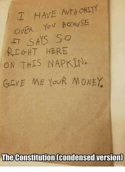 And right off the bat, in 21 words, it makes the Constitution just shows the ridiculousness of the idea. Well, of course, you can’t just write down on a piece of paper that you alone get to make up rules for everybody and steal the wealth of others. But that’s what they did. And then I have another one. You know, I’ve got another meme as an example, and it’s the Constitution condensed version, and it’s a napkin. And on the napkin, somebody scrawled, I have authority over you because it says so right here on this napkin.