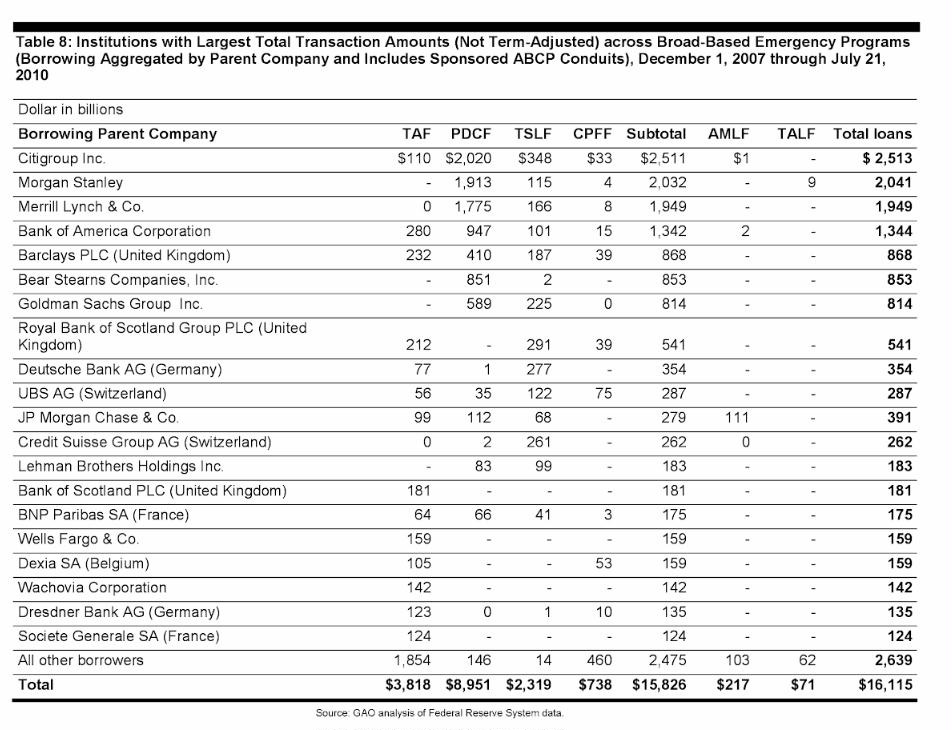 But there’s over a trillion missing from HUD, the post office, Amtrak, and other government programs that can account for over a trillion dollars. And then there’s been, according to an investigation Bloomberg did, over $16,000,000,000,000 [Etienne Note: $29 Trillion according to the Levy Institute at Bard College] that was handed to private banks and private companies like AIG and others during the TARP and the TALF and the Maiden Lane bailouts.