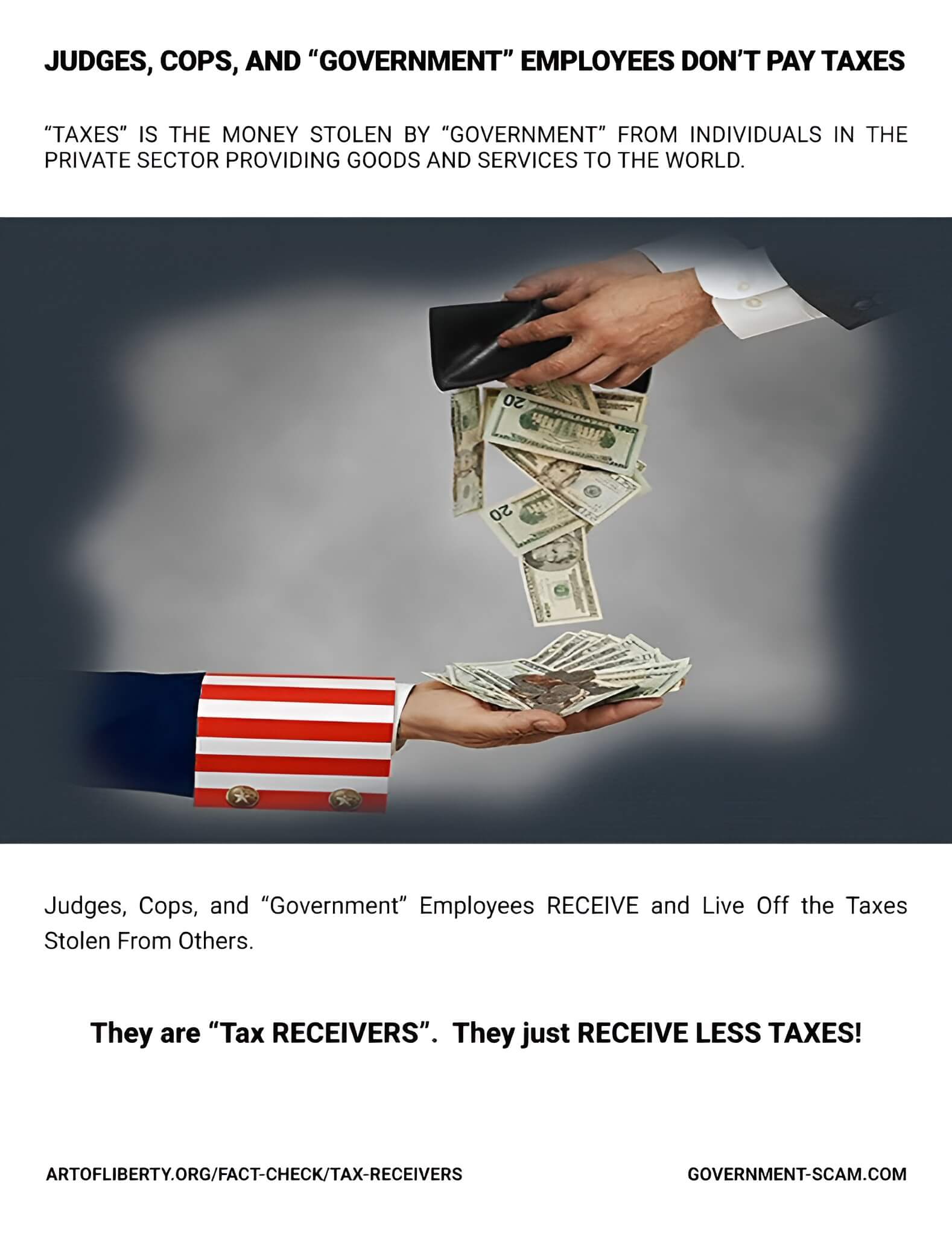The money for the salaries of “government” “workers” comes out of these taxes. The “government” “workers” receive and live off the taxes stolen from others. They are technically “tax-receivers”. The fact that taxes are also taken from their pay doesn’t change the fact they are simply receiving less taxes. The solution is to privatize “government” services (Voluntaryism) and expose the illegitimacy and criminality of “government”.