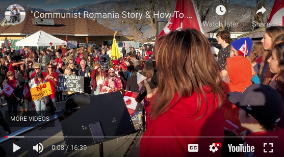 (In case the footage gets taken down from YouTube, you can watch it on Reddit at this link. If it gets removed from Reddit, you can search for it elsewhere under the title “Communist Romania Story & How To Revolution Okanagan Freedom Convoy Pt.2”).