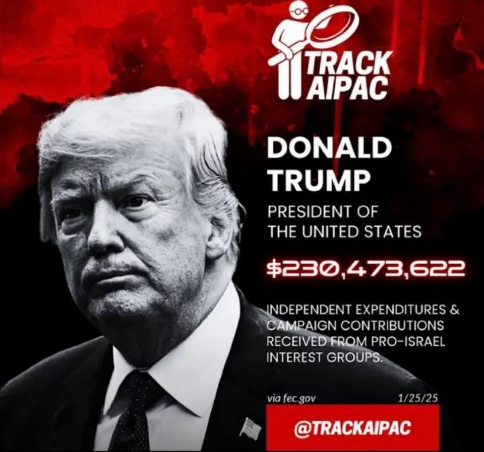 And not just Democrats. In announcing her resignation from Congress, the Republican firebrand Marjorie Taylor Greene tweeted that she takes no money from AIPAC– and “condemns Israeli genocide” — in contrast to Donald Trump, who has gotten over $230 million in pro-Israel money, and backs Israeli genocide to the hilt.