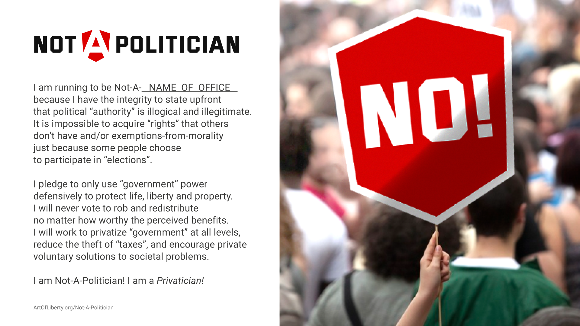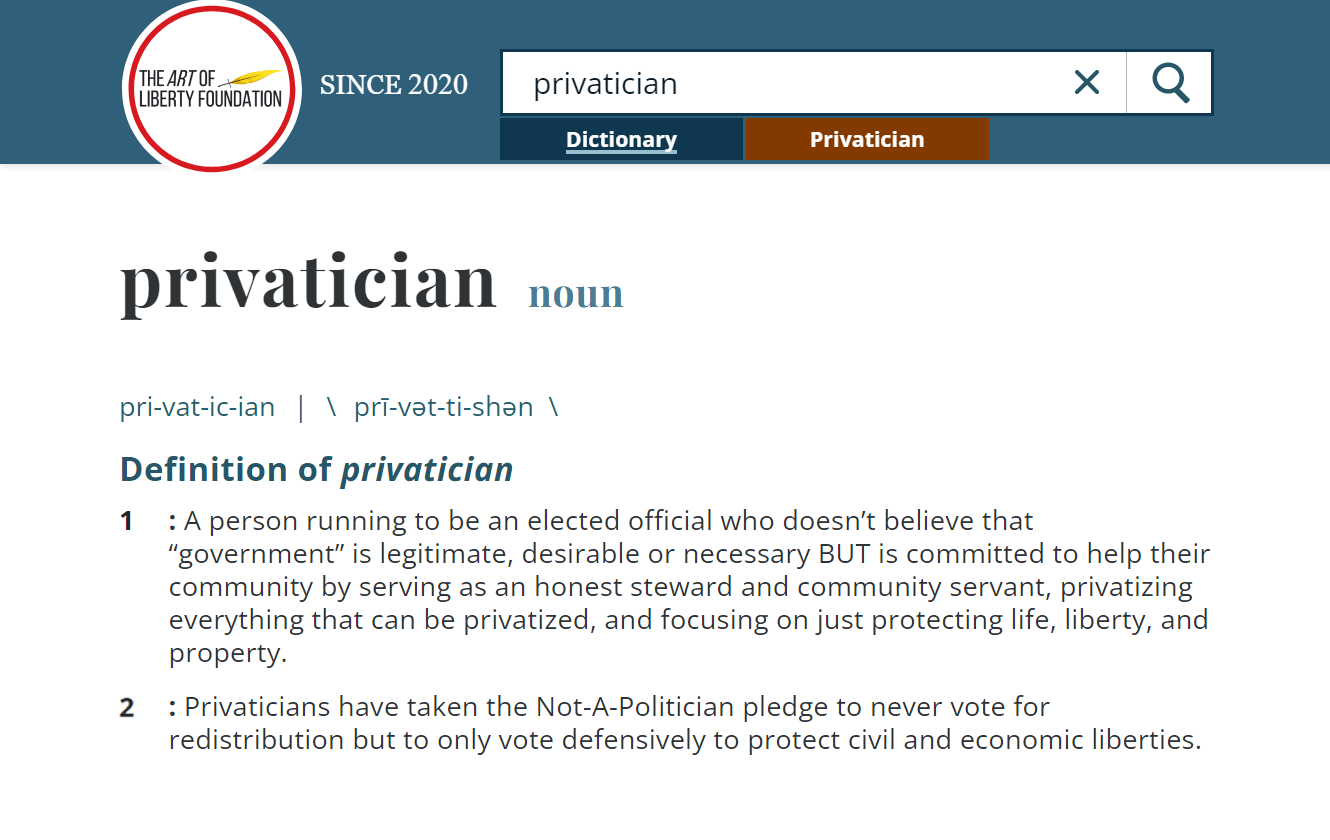While the Art of Liberty Foundation is exposing the illegitimacy and criminality of “government” and advocate for not wasting your time in the rigged poker game of organized crime’s rigged elections, we do support voting defensively. How can you determine if a political candidate is honest? We have developed the concept of a “Privatician”. Privaticians have the intellectual insight to understand that “government” is illegitimate on its face, but are willing to serve as community servants and stewards to protect life, liberty and property while pledging to never vote for redistribution. We have developed the following definition and pledge.