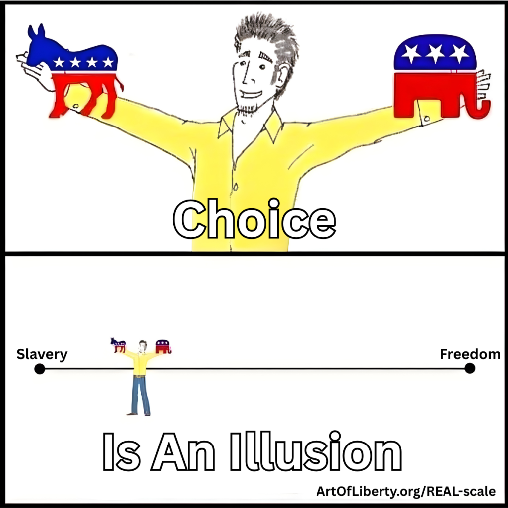 Because if they were honest about the political spectrum, it would make the engineered two-party system look way less attractive than it is now, it would illustrate that both parties support violent “government” control, and it would expose that there are more and better options than “Democrat” and “Republican”