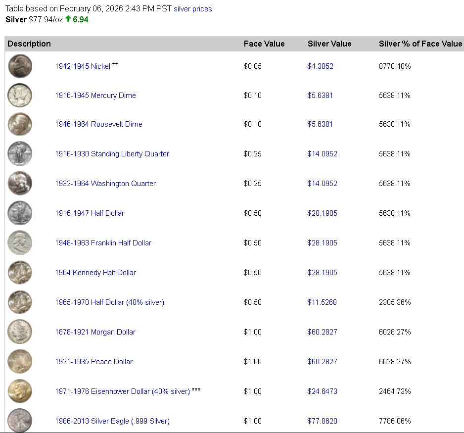 In this chart by the website Coinflation.com, you can see the current price in silver for pre-1965 nickels, dimes, quarters, half-dollars and silver dollars. Today the Nickel is the only US coin actually worth its weight in metal. Every other US “coin” (they are technically “tokens” now) is not worth the face value of the coin in the metal that it is made of.