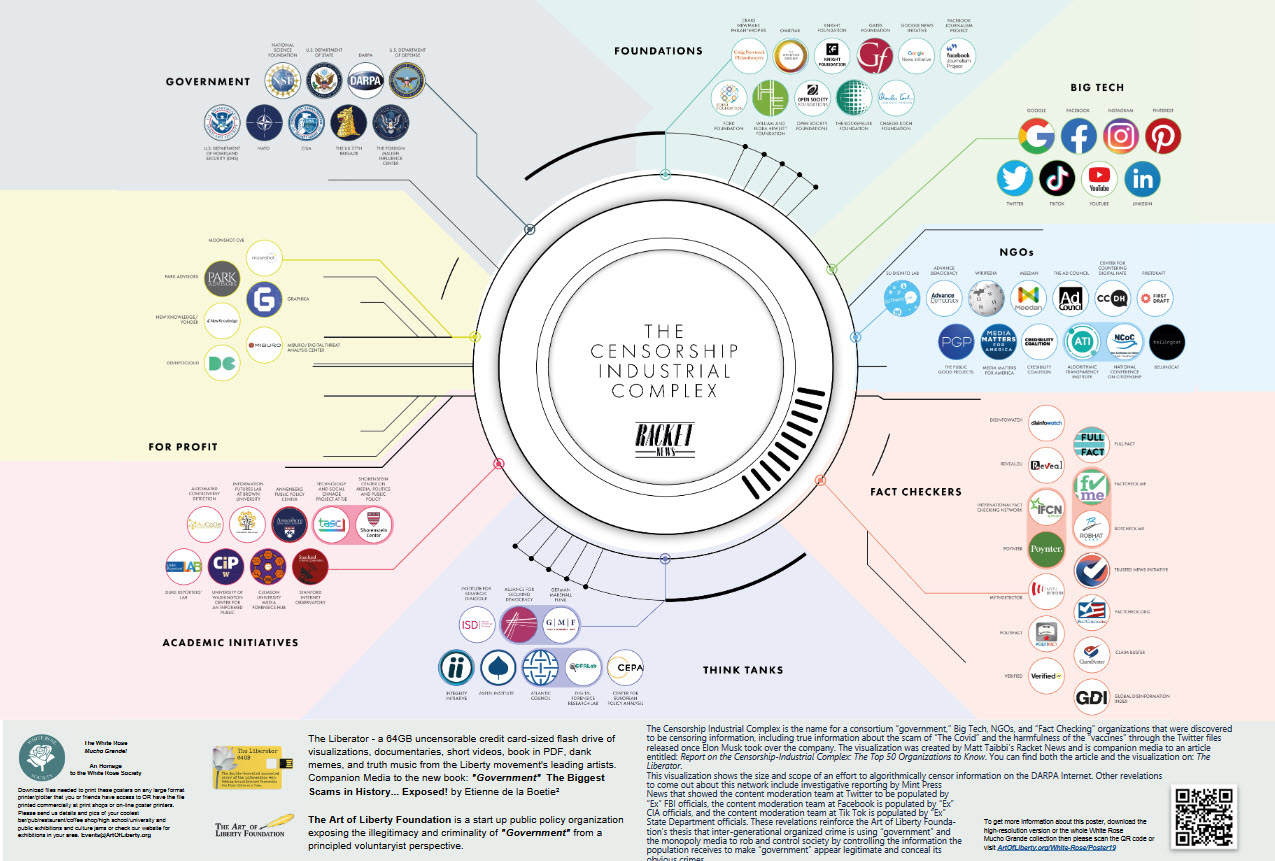 The Censorship Industrial Complex is the name for a consortium “government,” Big Tech, NGOs, and “Fact Checking” organizations that were discovered to be censoring information, including true information about the scam of “The Covid” and the harmfulness of the “vaccines” through the Twitter files released once Elon Musk took over the company. The visualization was created by Matt Taibbi’s Racket News and is companion media to an article entitled: Report on the Censorship-Industrial Complex: The Top 50 Organizations to Know. You can find both the article and the visualization on: The Liberator.