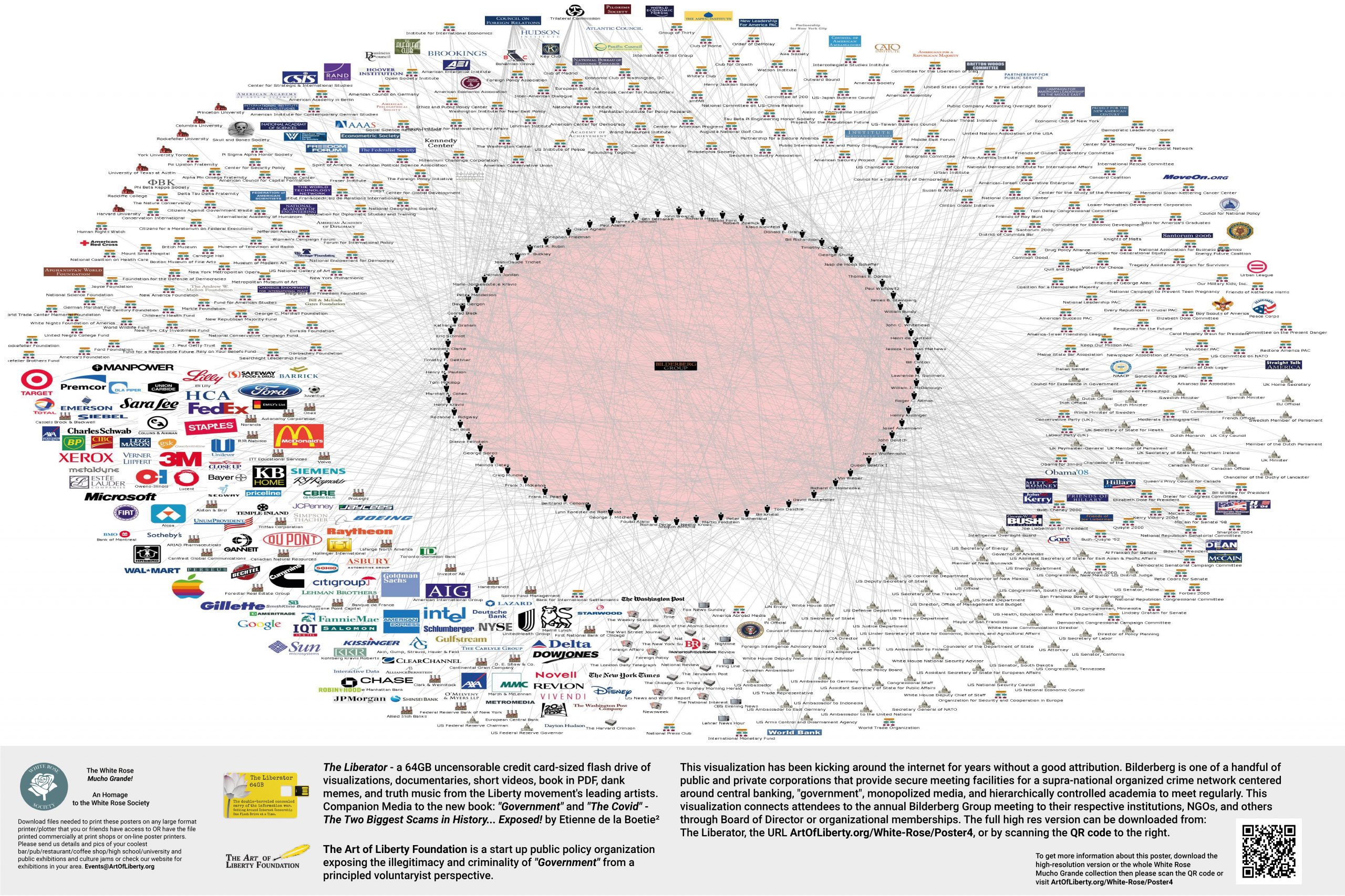 The White Rose – MUCHO GRANDE! Instead of stickers, we have a free file of POSTERS featuring the full-size, high-res visualizations from “Government” – The Biggest Scam in History… Exposed!, a book revealing how inter-generational organized crime runs the “government,” media and academia, and a series of visualizations showing the monopolization of: media, consumer goods, defense contractors, beer, beverages, meat processing, airlines, community newspapers, and banks among others. The posters are designed to be exhibited in coffee shops, university commons, and other high-traffic locations, including liberty festivals, conferences and events in a decentralized manner by any activist that understands the power of visualization.